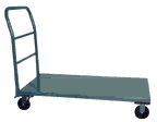 | Product Features: All welded construction Durable 12 ga steel platform with angle underbracing and 12 ga caster mounts Tubular handle with smooth radius bend for comfort and appearance Platform Height: 10" high Handle height above deck: 30" Capacity: 1,800# Casters: 5" Urethane - 2 swivel, 2 rigid |