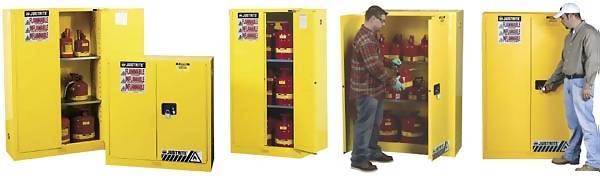 Store flammables in Justrite safety storage cabinets, safe from fire or